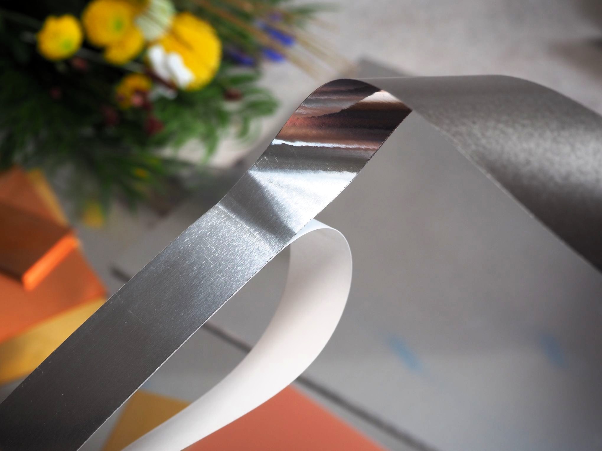 表面に光沢のある 0.05mm厚のアルミ箔に、導電性及び難燃性に優れたアクリル系粘着剤が塗布された片面粘着テープです。